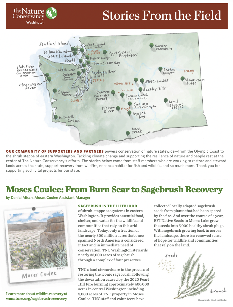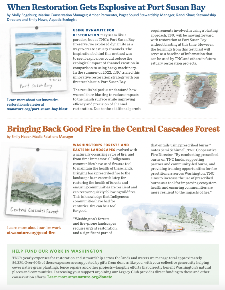 Want to learn more about the work our community of members help support? The stories below come from staff members who are working to restore and steward lands across the state, support recovery from wildfire, enhance habitat for fish and wildlife, and so much more.